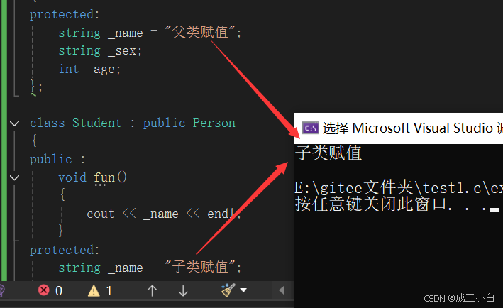 注意:不可见不是不存在,存在但是用不了,即使是自己的成员函数也不可以访问,只有调用父类的成员函数间接访问。