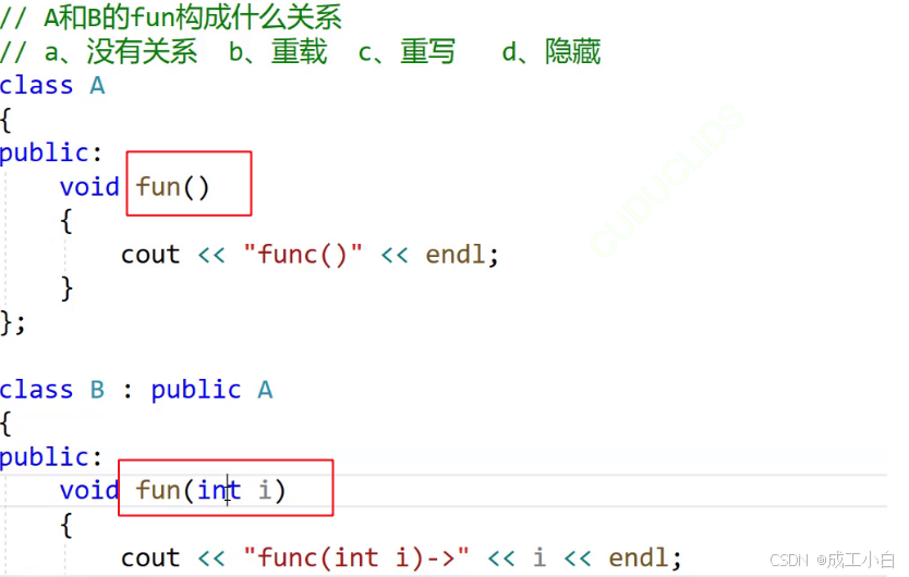 父类和子类是属于两个作用域,而重载是需要再同一作用域中才能构成重载,所以b排除,最后,如果是成员函数:子类和父类中只要函数名相同就会构成隐藏关系(与返回值和参数列表无关)。