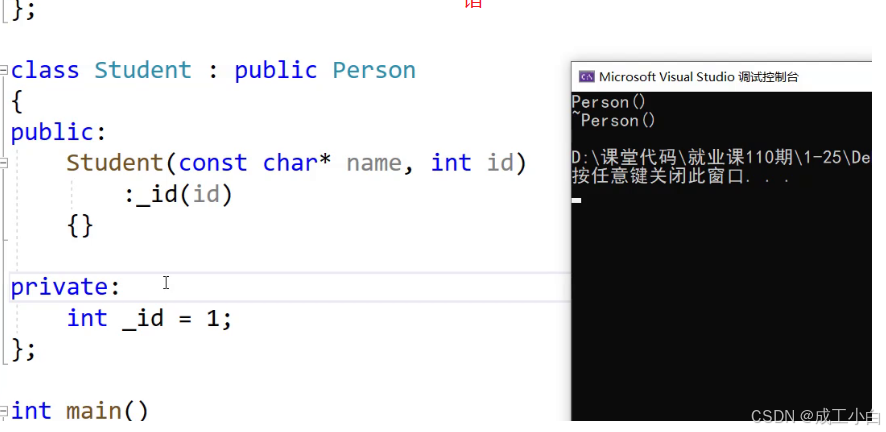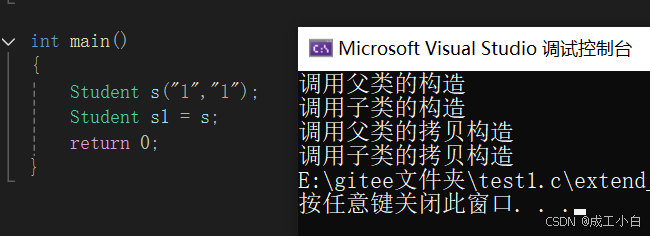 显示写拷贝构造,因为跟自定义类型处理方式类似,子类成员调用子类的拷贝构造,父类成员调用父类的拷贝构造,所以我们需要知道谁是父类的成员,这里就需要用到赋值兼容的知识,也就是切割问题,直接把子类对象传递给父类的拷贝构造,父类会自己割出自己的那部分。