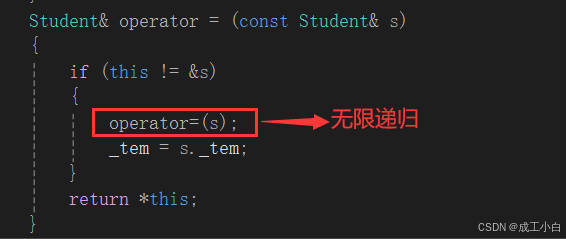 因为子类赋值重载与父类的赋值重载函数名相同,所以构成隐藏关系,所以这样写的话是子类自己无限递归了,这时我们要调用父类的赋值重载就需要指定作用域: