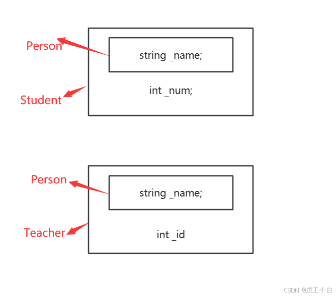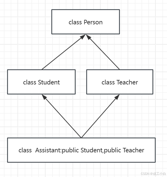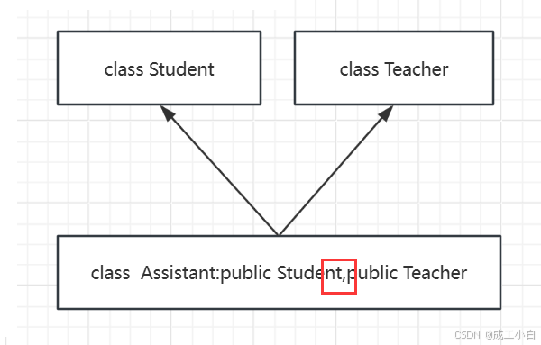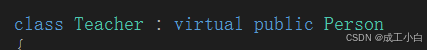 对_name访问不明确,因为既有来自student的_name,还有来自teacher的_name。 第一种解决方法是: 访问_name时可以指明作用域,但是这样只能暂时解决二义性的问题,没有解决本质问题,有些信息不可能存在两份,如年龄,学号等等,这样设置就会存在空间浪费。 第二种也是最合适的解决方法:使用虚继承,如下:
