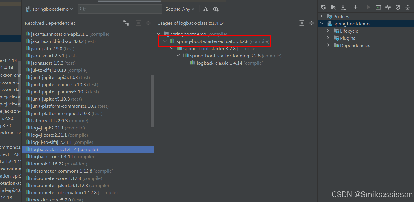这可真是纳了闷了,我一度以为是我的maven没有生效,疯狂的进行maven更新以及clean和install,结果发现都不起作用,当时都崩溃了,不明白为啥已经去除了还存在,网上搜了一下,才知道有可能是其他的包也引入了logback,也就是需要找到哪里引入的,依旧查看maven的包,找到罪魁祸首了,因为我还引入了actuator包,这个包也引入了logback
