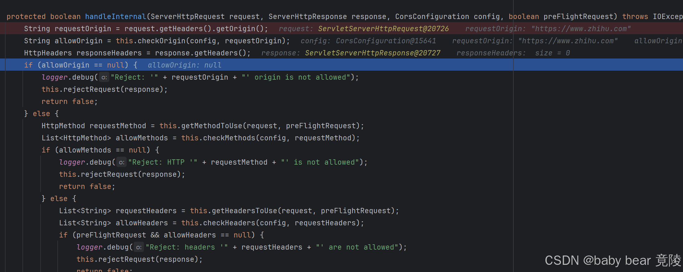 问题到这里很清晰了,当程序执行到objectutils.isempty(this.allowedorigins)或者this.allowedorigins.contains("*"),if语句的条件不成立了,因为this.allowedorigins并不包含客户端的域名,也就是例子中的https://www.bilbili.com或者https://www.zhihu.com,我们要处理的正是allowedorigins,