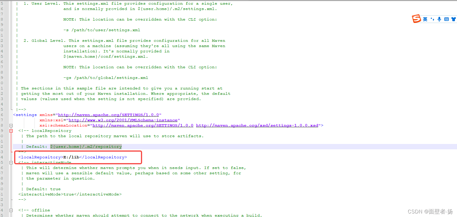 说明: 由于我们优先从本地仓库获取依赖,环境变量中已配置maven的地址,找到maven的安装路径下conf文件夹下的的settings.xml文件,修改本地仓库的地址,默认是${user.home}/.m2/repository,建议修改成c盘外的其他地址;如下图我的本地仓库地址是e:/lib;