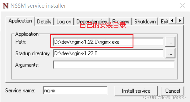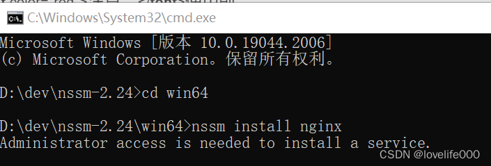 解压压缩包到目录 ,打开命令行 cmd 进入到 nssm 目录,执行服务安装