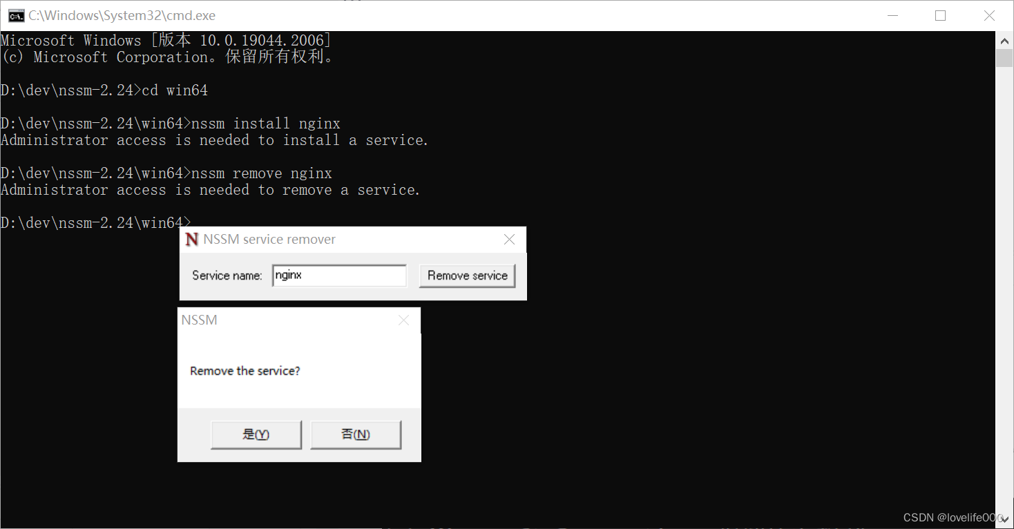 删除服务,同样在nssm路径下输入nssm remove nginx