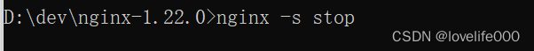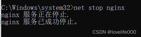 如果想要关闭服务的话在命令提示符(管理员模式)下输入net stop nginx命令