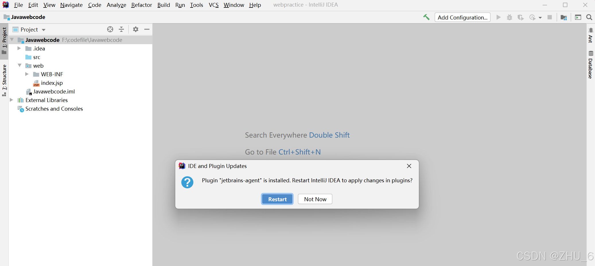至此,项目搭建完成。将准备里面的有个java文件,叫jetbrains-agent文件,直接拖进刚刚我们建好的javaweb项目里面去,不要管发生了啥,直接拖进去,会是这个样子: