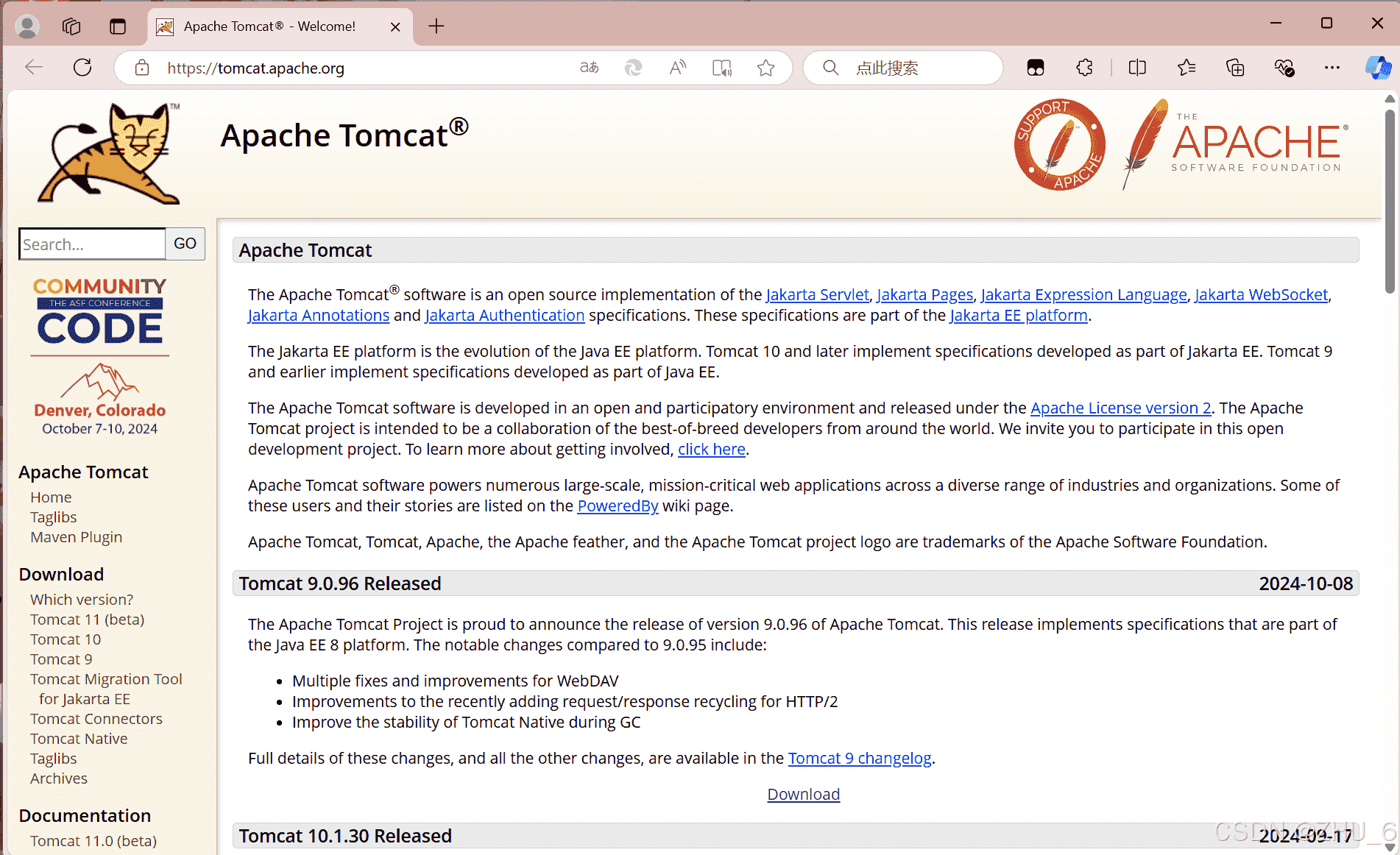 在最左面,找download,会有tomcat 11(beta版)、10、9等等版本,到底下载那个呢?根据自己的java jdk版本进行选择。对应关系如下:jdk版本1.8.xxx的,tomcat版本最高到9.0.xx,jdk 17以上的,可以使用tomcat10以上的版本。这个也与idea的版本有关,idea越新,所需要的jdk版本越高,tomcat版本也就越高。idea2020还稳定支持jdk1.8,所以tomcat最高可到9.0.xx。