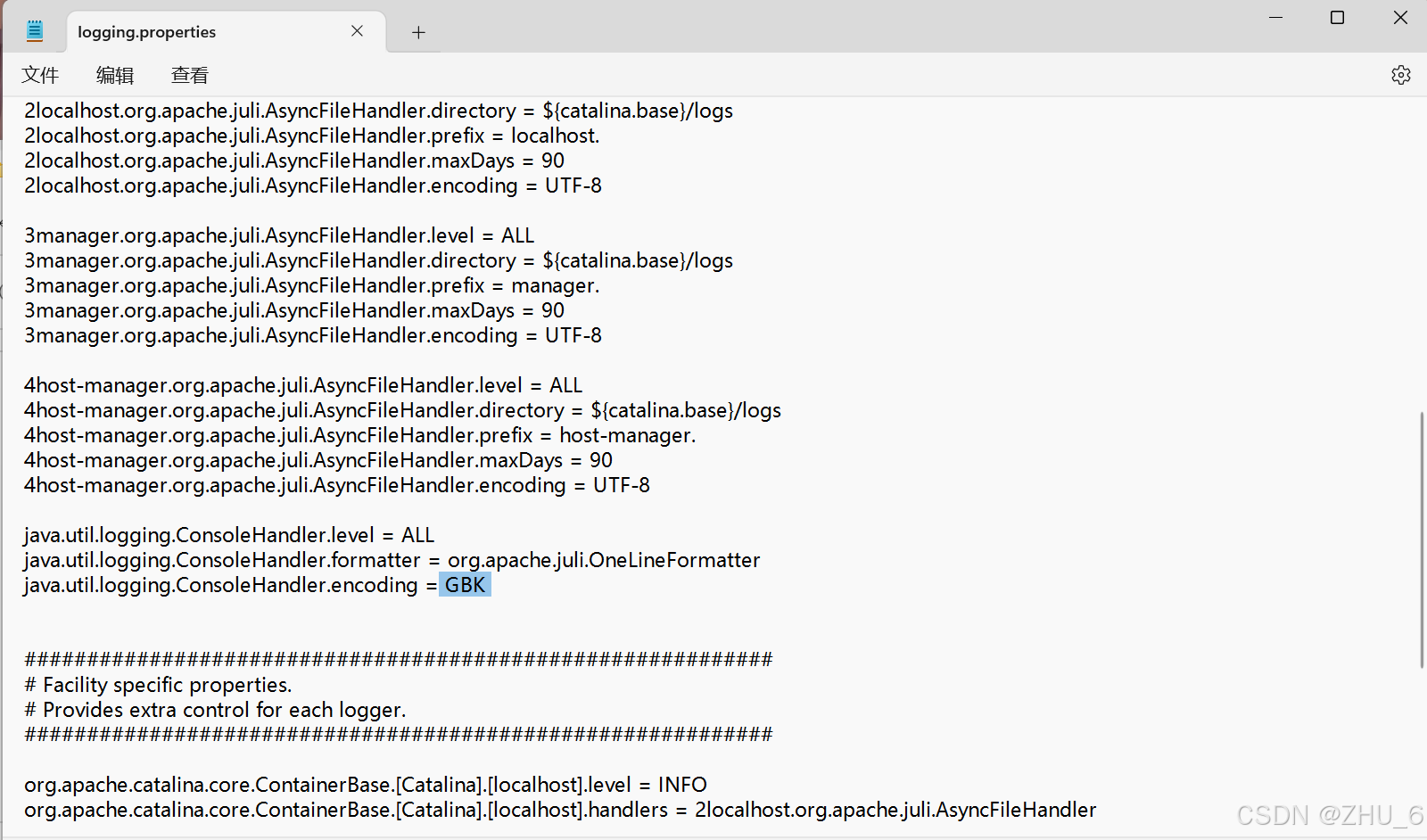 接下来,需要打开解压缩的tomcat文件夹,找到conf文件夹,找到logging.properties文件,用记事本打开(vscode打开也可),找到java.util.logging.consolehandler.encoding = utf-8 这行代码,修改成java.util.logging.consolehandler.encoding =gbk,就ok。