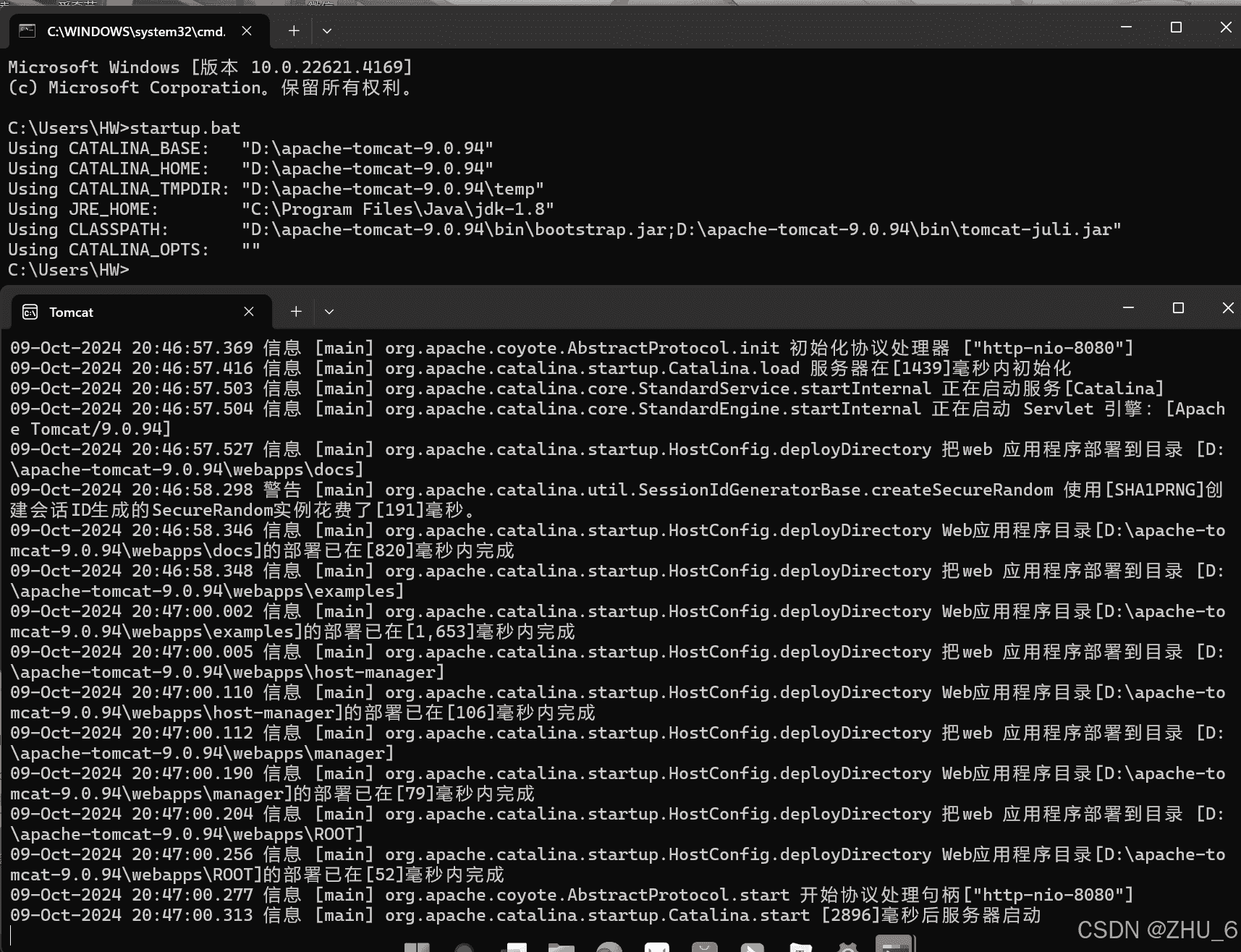 按照如下命令,进行测试。打开命令提示符,输入startup.bat,回车,不要关闭命令提示符,会自动弹出另一个命令提示符,都不要关闭,等到第二个全部显示完毕,不动的时候,如图所示: