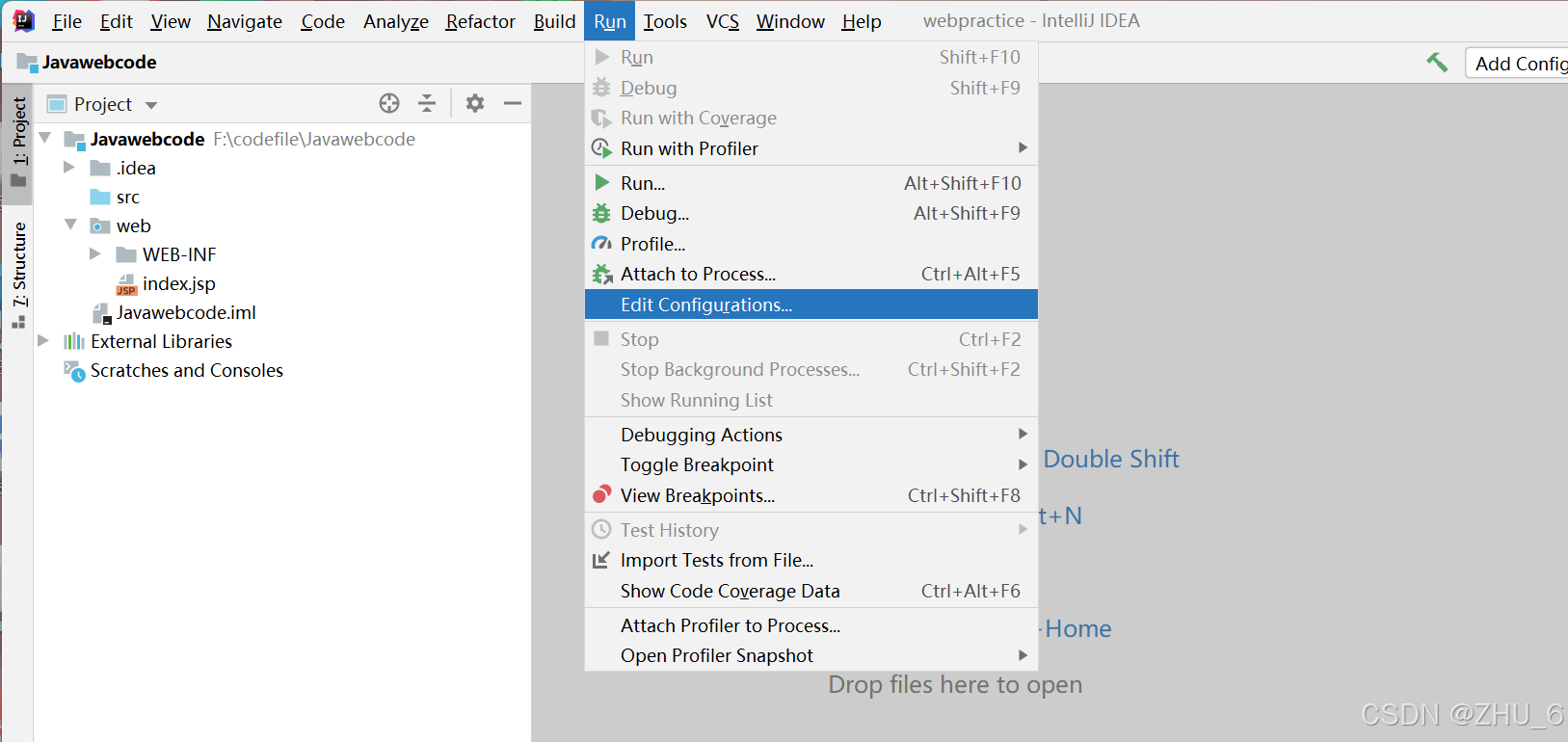 打开创建的项目,在最上方栏目,里面有一个run栏目,里面有一个edit configutations,单击进去,如图所示: