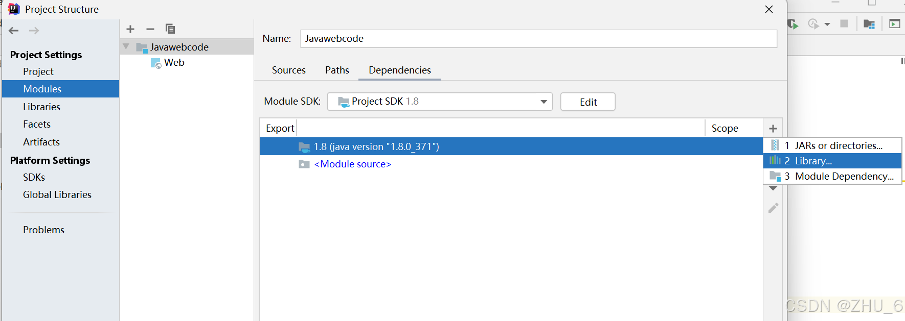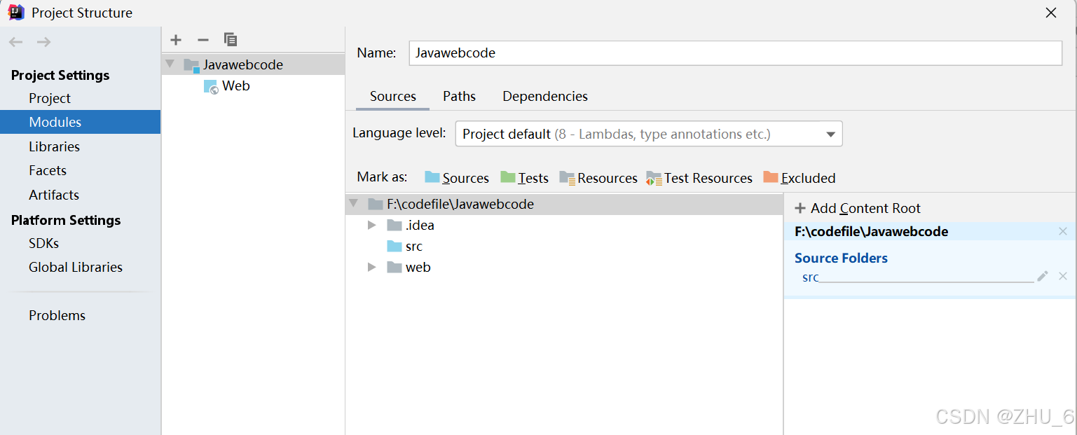 点击左上角的file栏,里面一个选项叫:project structure,单击进去,单击左边栏目的modules,如图所示: