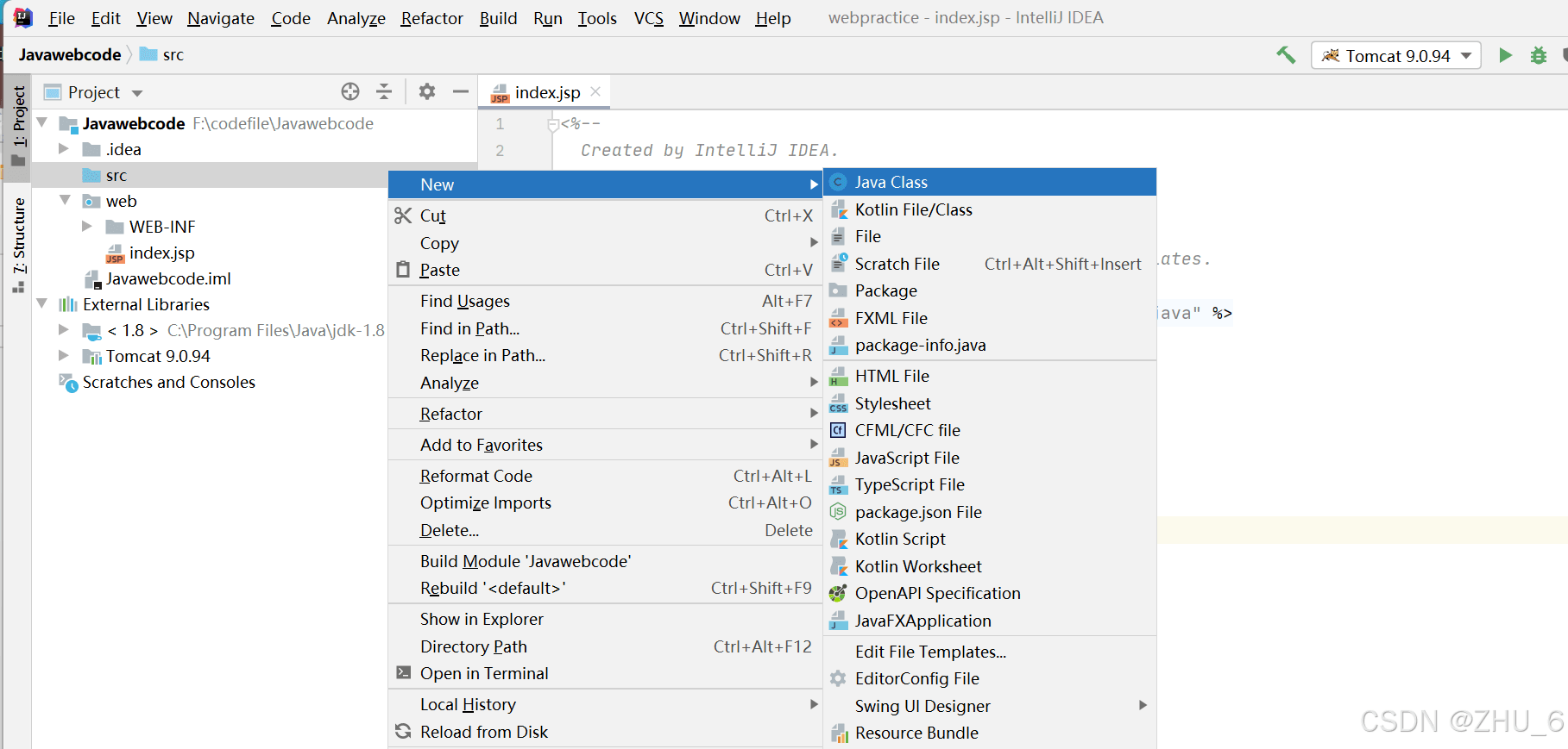 在src文件夹下,右击创建java类,命名为servlet001。如图所示: