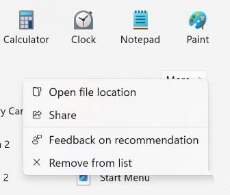 微软正在开始菜单的推荐部分下显示右键共享本地文件的选项。