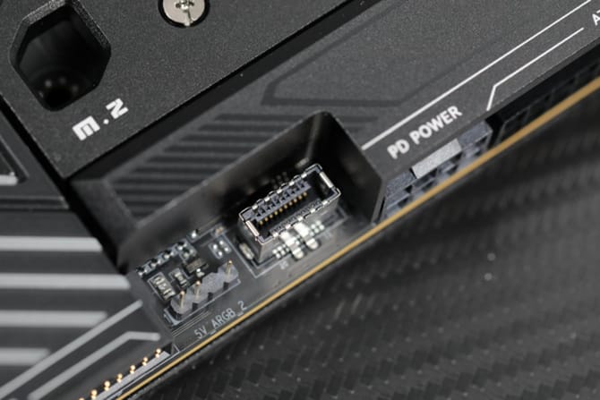 来到细节上,主板将24pin的供电接口放在了侧面,旁边还有一个额外的pd供电,可以为前置的usb-c接口提供60w的pd 3.0供电支持。