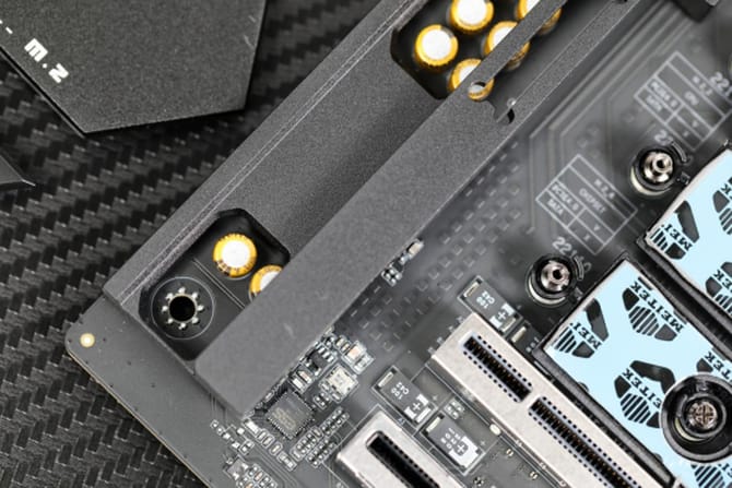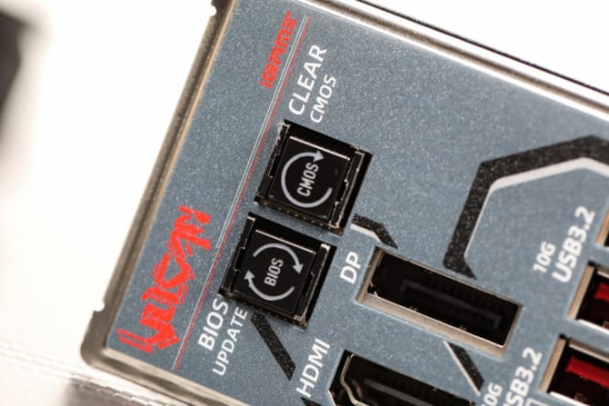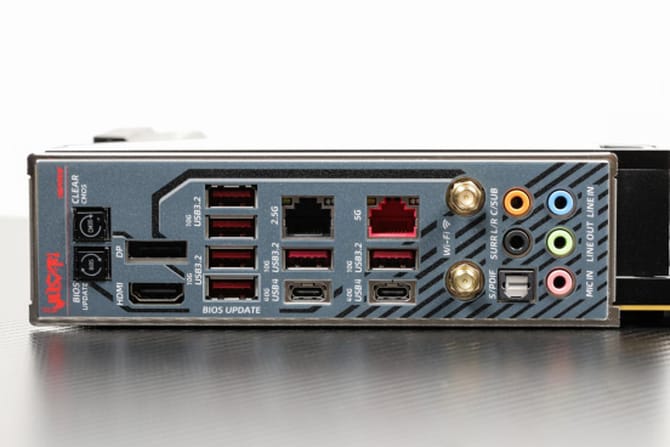 主板的i/o区,一体化的挡板设计,装机更加简便,接口配置上同样非常丰富,提供了bios更新和清理cmos按键,1个hdmi 2.0和dp 1.4接口,6个usb 3.2gen2 10gbps type-a接口,2个usb4 40gbps type-c接口,支持4k60hz视频输出,还有1个2.5g和5g的网口,2个wifi 7天线以及5个音频输出接口,配置非常丰富,满足广大玩家的实际需求。