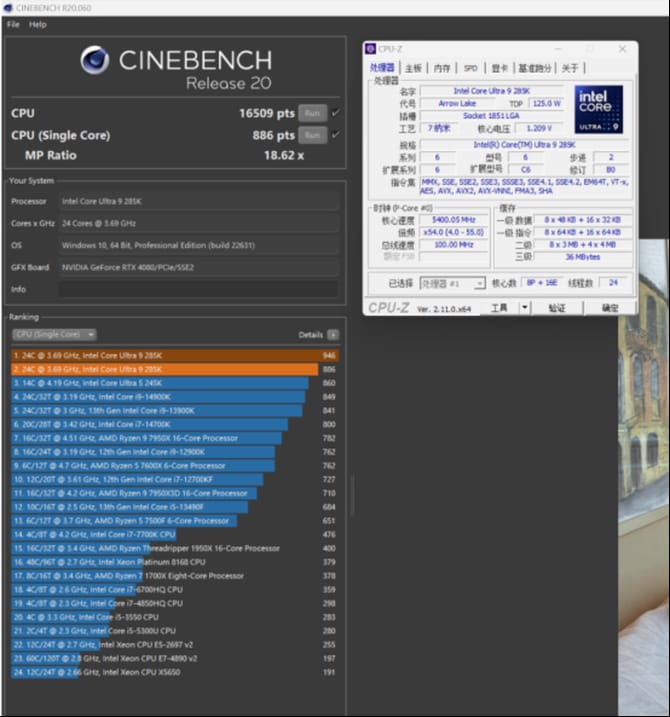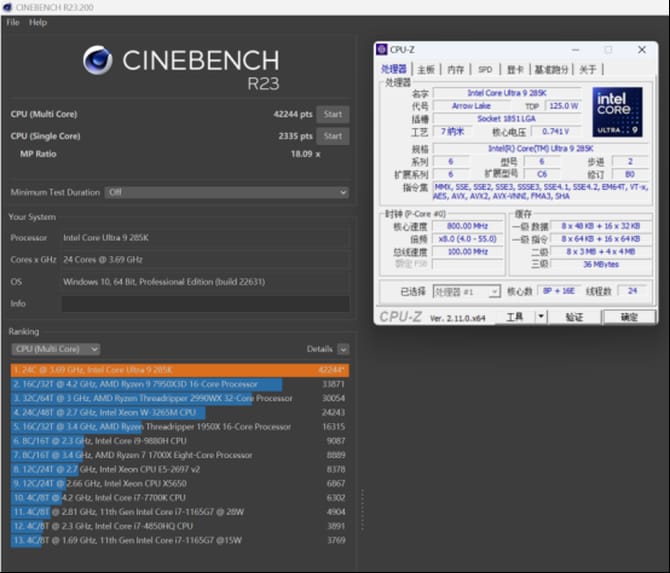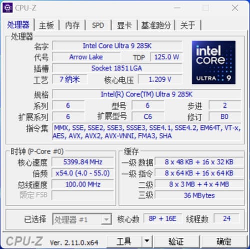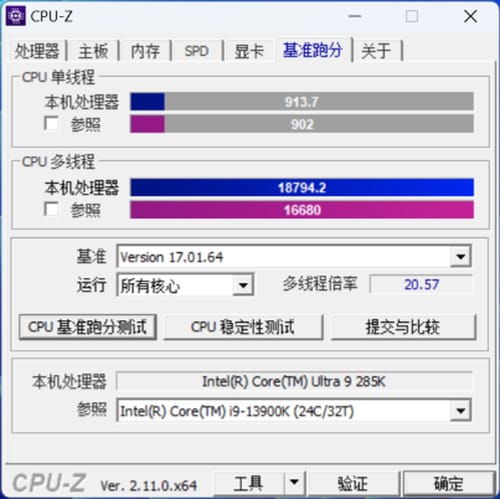 cpu-z性能测试上,285k的成绩对比13900k有着明显的优势,尤其是多线程跑分上。
