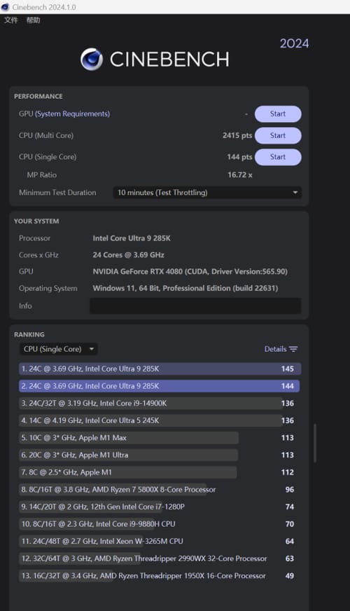 cinebench 2024的测试中,多核心成绩为2414,单核心成绩为144,基准性能表现出色,能够完全发挥全新的英特尔酷睿ultra系列处理器的全部性能。