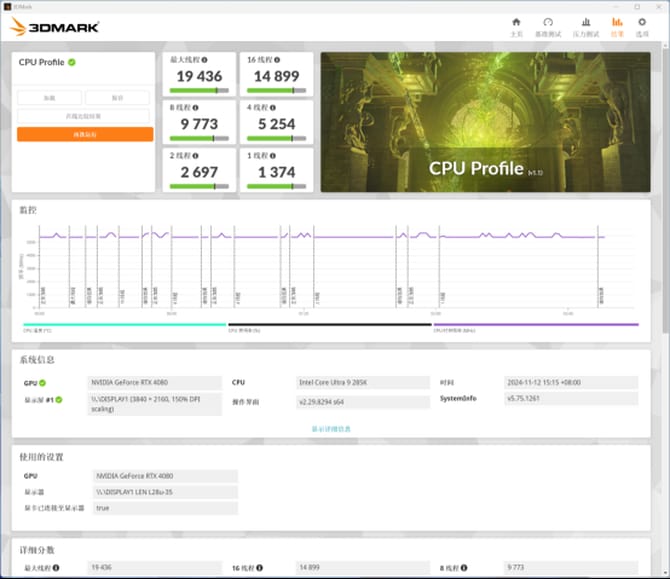 3dmark测试中,cpu profile的单线程性能为1374,最大线程的性能为19436.