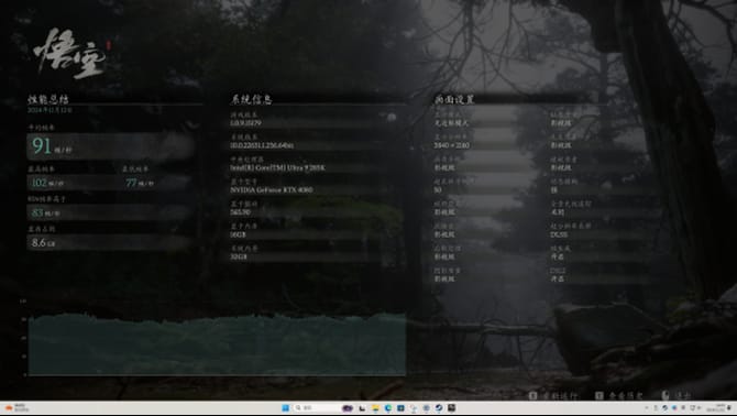 首先是黑神话:悟空,我们使用4k分辨率,推荐的电影级特效和默认dlss,最终的游戏帧数为91,游戏画面丝滑流畅,体验非常不错。