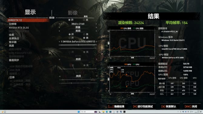 古墓丽影:暗影同样选择了4k分辨率,最 高特效,最终游戏帧率为154,性能出色,可以轻松征战4k游戏。
