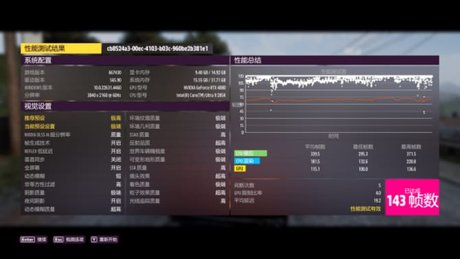 地平线5的话,同样使用了4k分辨率,极端特效,最终的游戏帧数为143,能够丝滑流畅运行。