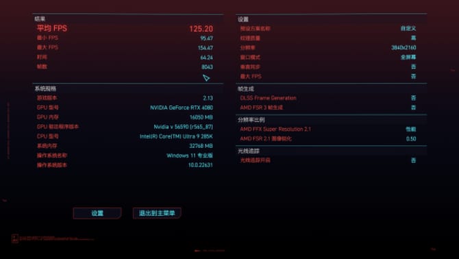 赛博朋克2077,4k分辨率,高特效,dlss性能档位,最终的游戏平均帧数为125.20,性能优秀。