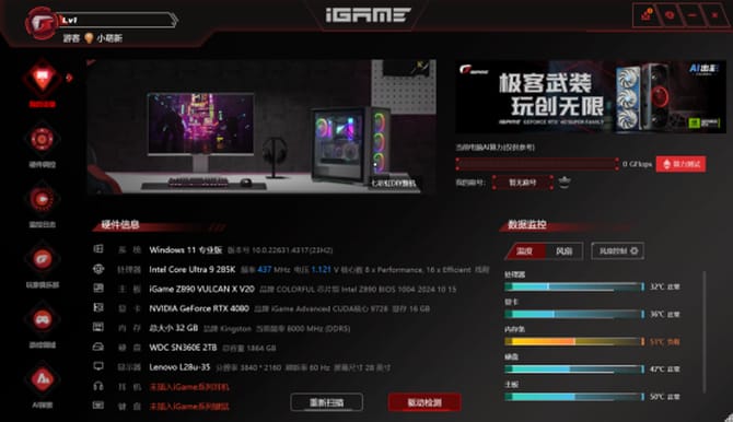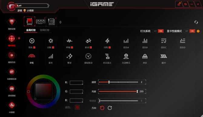 除此之外,对于非常多的玩家来讲,软件控制系统同样带来更多的可玩性,也能实现手动超频硬件,用户可以在最 新版的igame center软件内对整套平台进行控制,包括灯光效果、风扇转速等,还可以手动超频,不光能实现rgb灯光秀,还能提升性能,可玩性非常不错。