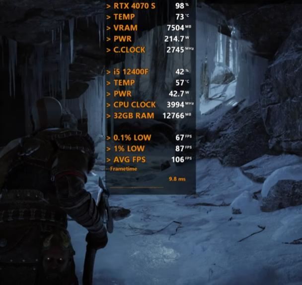 平均帧速为106 fps,最低瞬时帧速为87 fps,帧时间为9.8ms,cpu使用率为42%,功耗为43w,温度为57度,内存使用量为12.8gb,gpu使用率为98%,显存使用量为7.5gb,功耗为215w,温度为73度。