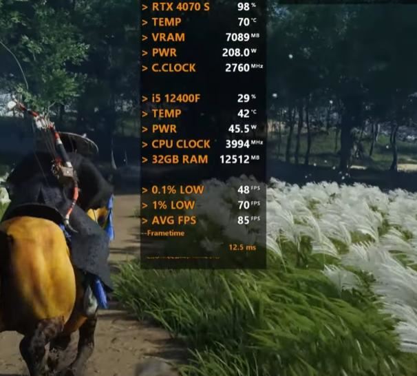 平均帧速为85 fps,最低瞬时帧速为70 fps,帧时间为12.5ms,cpu使用率为29%,功耗为46w,温度为42度,内存使用量为12.5gb,gpu使用率为98%,显存使用量为7.1gb,功耗为208w,温度为70度。
