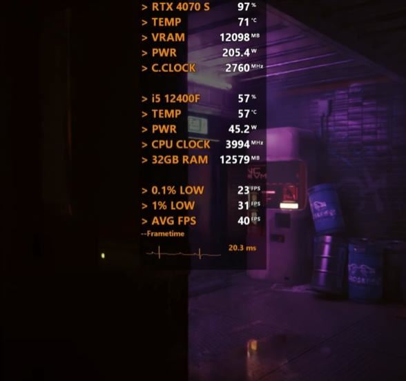 平均帧速为40 fps,最低瞬时帧速为31 fps,帧时间为20.3ms,cpu使用率为57%,功耗为45w,温度为57度,内存使用量为12.6gb,gpu使用率为97%,显存使用量为12.1gb,功耗为205w,温度为71度。
