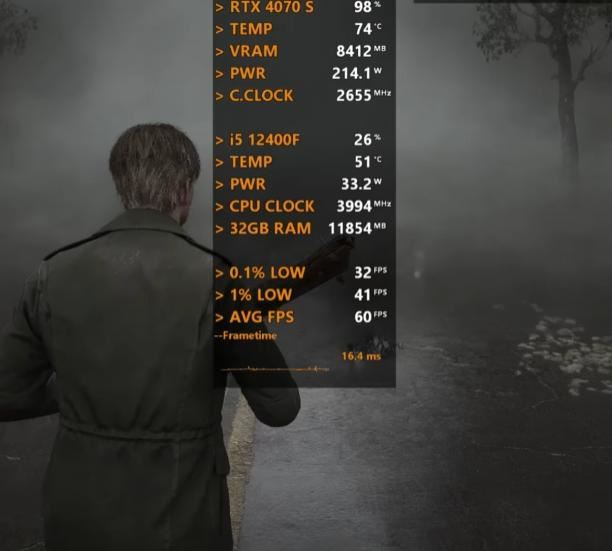 平均帧速为60 fps,最低瞬时帧速为41 fps,帧时间为16.4ms,cpu使用率为26%,功耗为33w,温度为51度,内存使用量为11.9gb,gpu使用率为98%,显存使用量为8.4gb,功耗为214w,温度为74度。