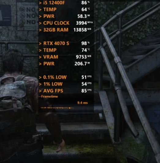 平均帧速为85 fps,最低瞬时帧速为54 fps,帧时间为9.4ms,cpu使用率为86%,功耗为58w,温度为64度,内存使用量为13.9gb,gpu使用率为98%,显存使用量为9.8gb,功耗为207w,温度为74度。