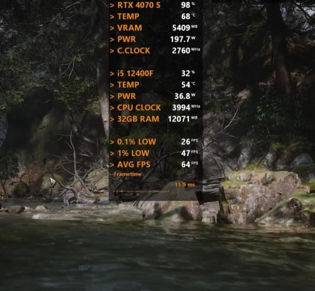 平均帧速为64 fps,最低瞬时帧速为47 fps,帧时间为15.9ms,cpu使用率为32%,功耗为37w,温度为54度,内存使用量为12.1gb,gpu使用率为98%,显存使用量为5.4gb,功耗为198w,温度为68度。