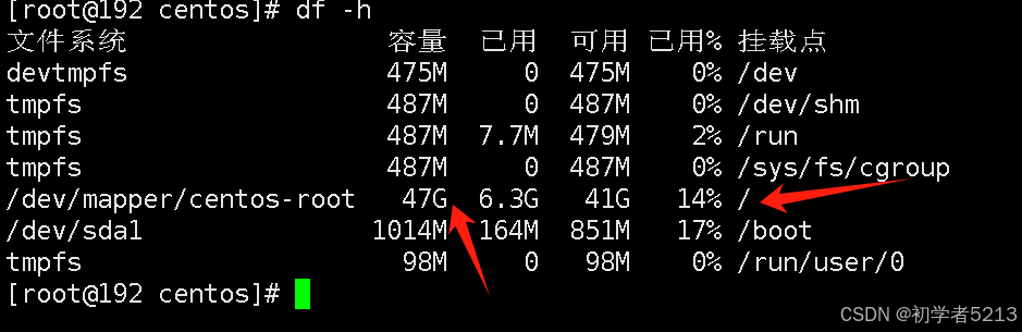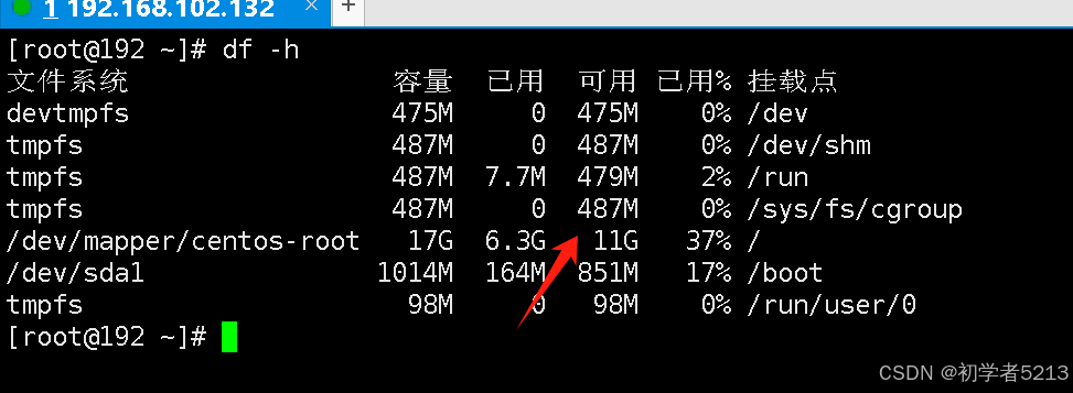1.先看看原来的磁盘信息,目前磁盘是20g的,重点关注红色箭头指向的地方,一个17g 可用11g,接下来要对其进行扩展
