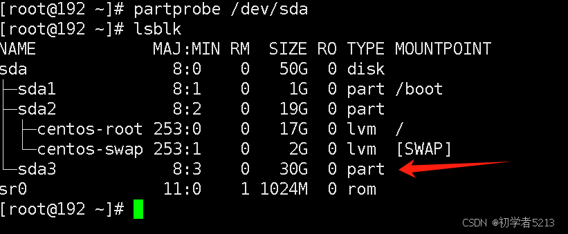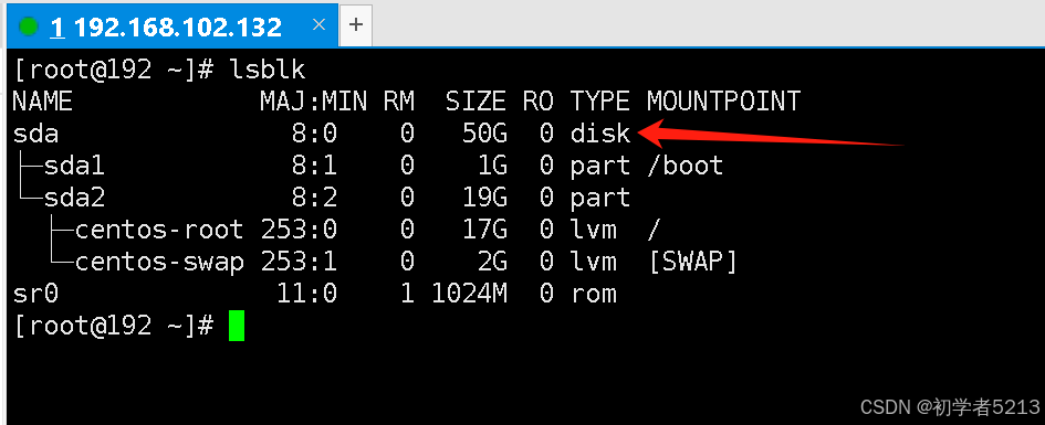 3.重新开启虚拟机,查看磁盘信息,注意红色箭头地方,50g和刚刚扩展的大小一样,说明成功了,但是这个时候我们扩展的磁盘容量还看不见,但是扩展的也是在sda这个下面。接下来我们需要创建分区