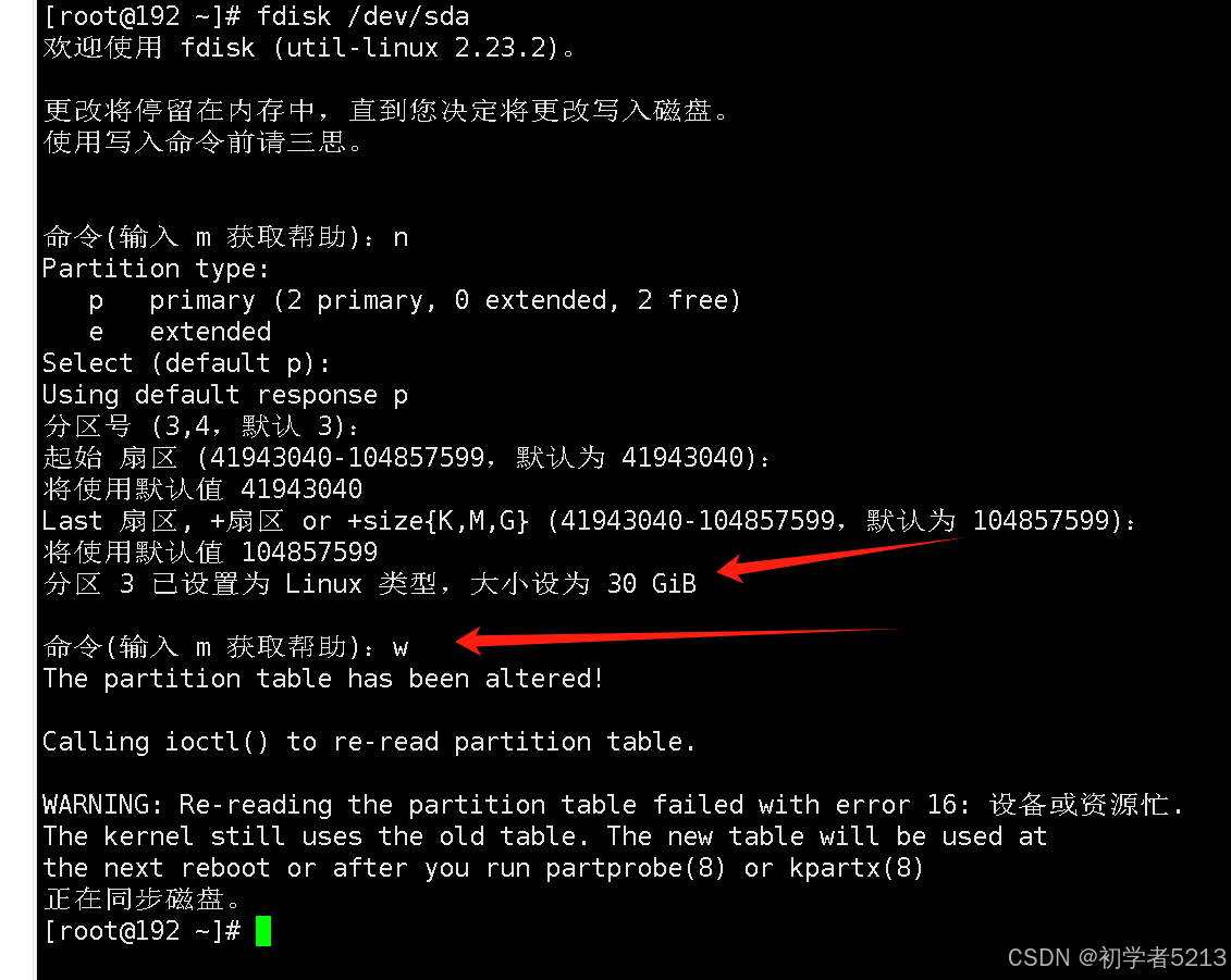 4.创建分配,先输入n 你表示新建分区,后面默认回车就行,到最后红色箭头位置输入w w表示保存上面已经执行过的操作的意思