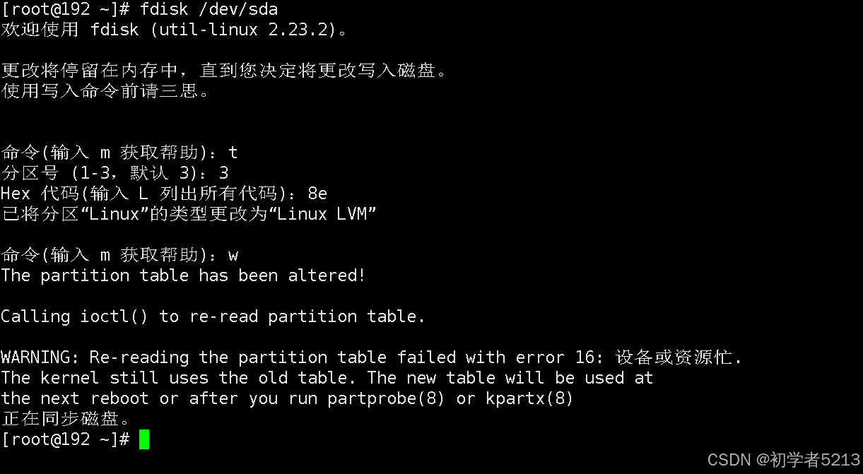 6.修改分区的类型,把part类型改为lvm ,t表示修改分区类型,3对应sda3 也就是刚刚创建的分区,w保存操作