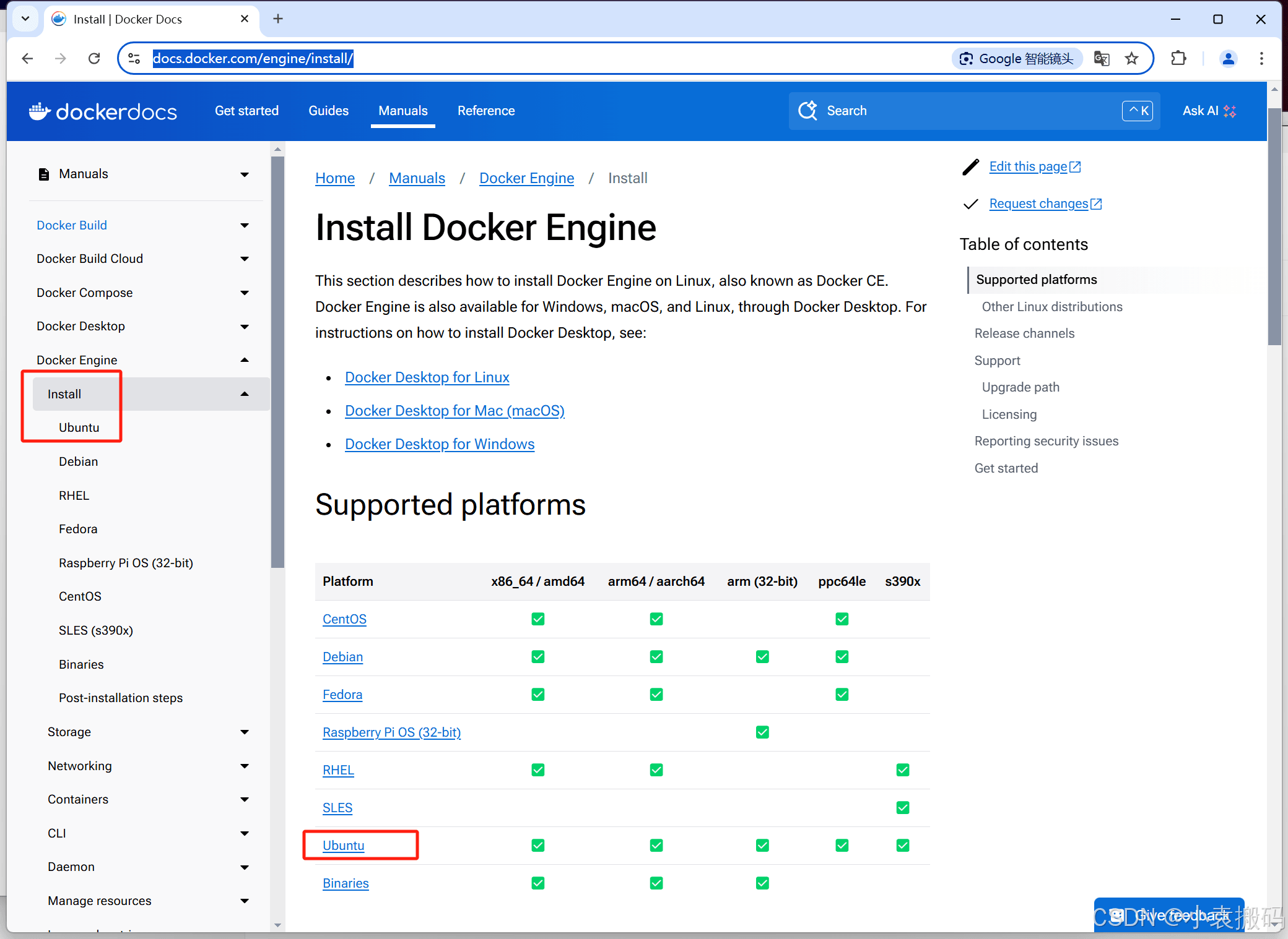 官网安装文档: https://docs.docker.com/engine/install/,如下图