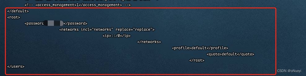 在中间部分可以看到有一个users节点,里面有一个default账号密码是空的,需要在default账号下面再增加一个root账号密码为123456