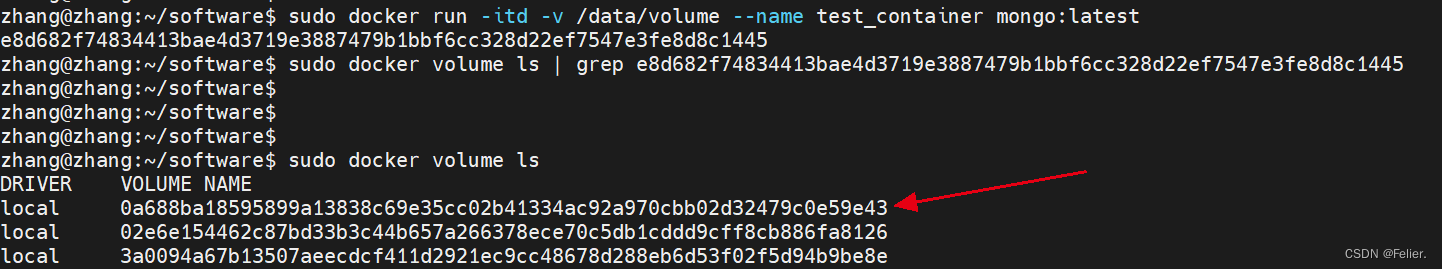 这种情况下,我们可以看到,当我们通过docker volume ls查看卷标的时候,我们只能查看到其对应的“匿名”的数据卷。