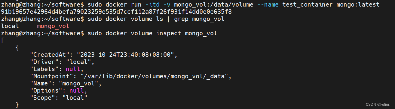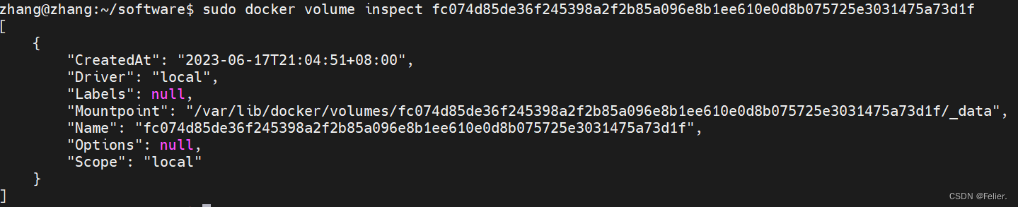 # 查看所有的数据卷 sudo docker volume ls # 查看指定数据卷的详细信息 sudo docker volume inspect 数据卷名称