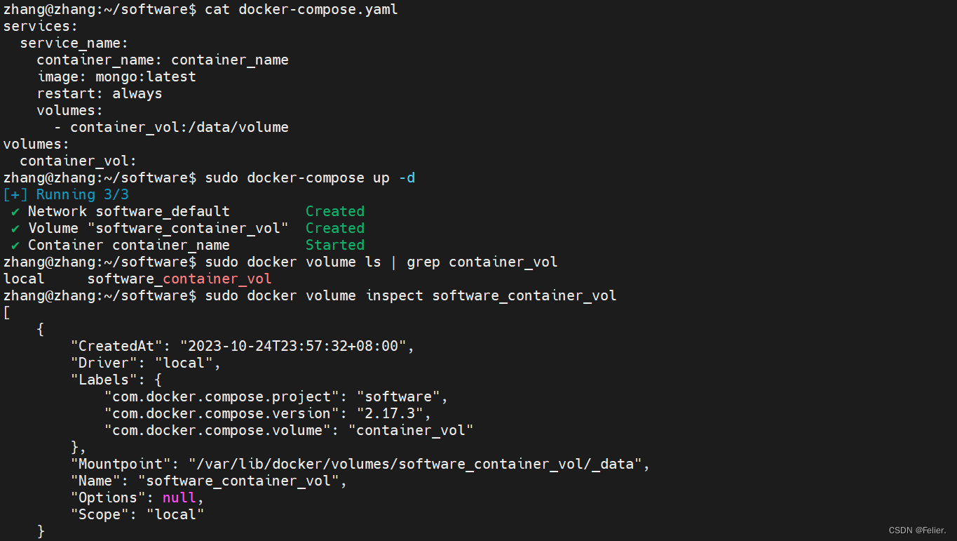 可以看到,当我们通过docker-compose启动容器时,数据卷的名称多了一个software的前缀,而这正是docker-compose.yaml的存放路径,同时其挂载点在/var/lib/docker/volumes/<yaml路径_数据卷名称>/_data下面的。