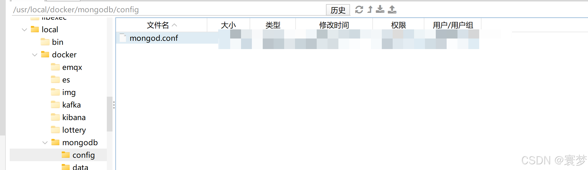 将主机的配置文件 /usr/local/docker/mongodb/config/mongod.conf 挂载到容器的 /etc/mongod.conf 位置,使容器使用主机上的配置文件来启动 mongodb 服务。