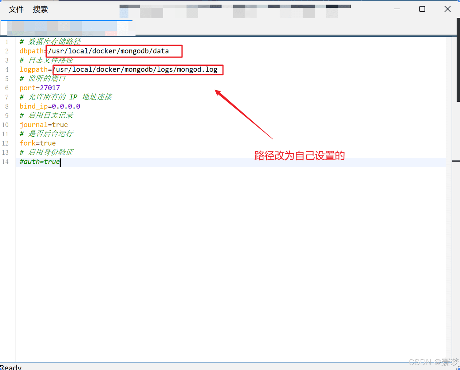 使用 vi 或 vim 编辑器打开mongod.conf文件