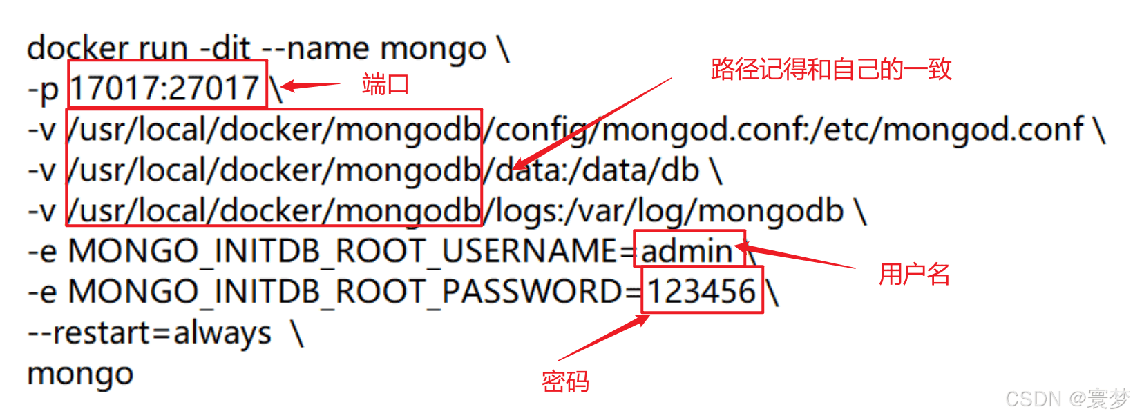 docker run -dit --name mongo \ -p 17017:27017 \ -v /usr/local/docker/mongodb/config/mongod.conf:/etc/mongod.conf \ -v /usr/local/docker/mongodb/data:/data/db \ -v /usr/local/docker/mongodb/logs:/var/log/mongodb \ -e mongo_initdb_root_username=admin \ -e mongo_initdb_root_password=123456 \ --restart=always \ mongo