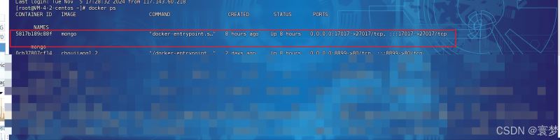 将主机的 17017 端口映射到容器的 27017 端口,这样主机通过 17017 端口可以访问到容器内 mongodb 服务的 27017 端口。mongodb 默认的端口是 27017。