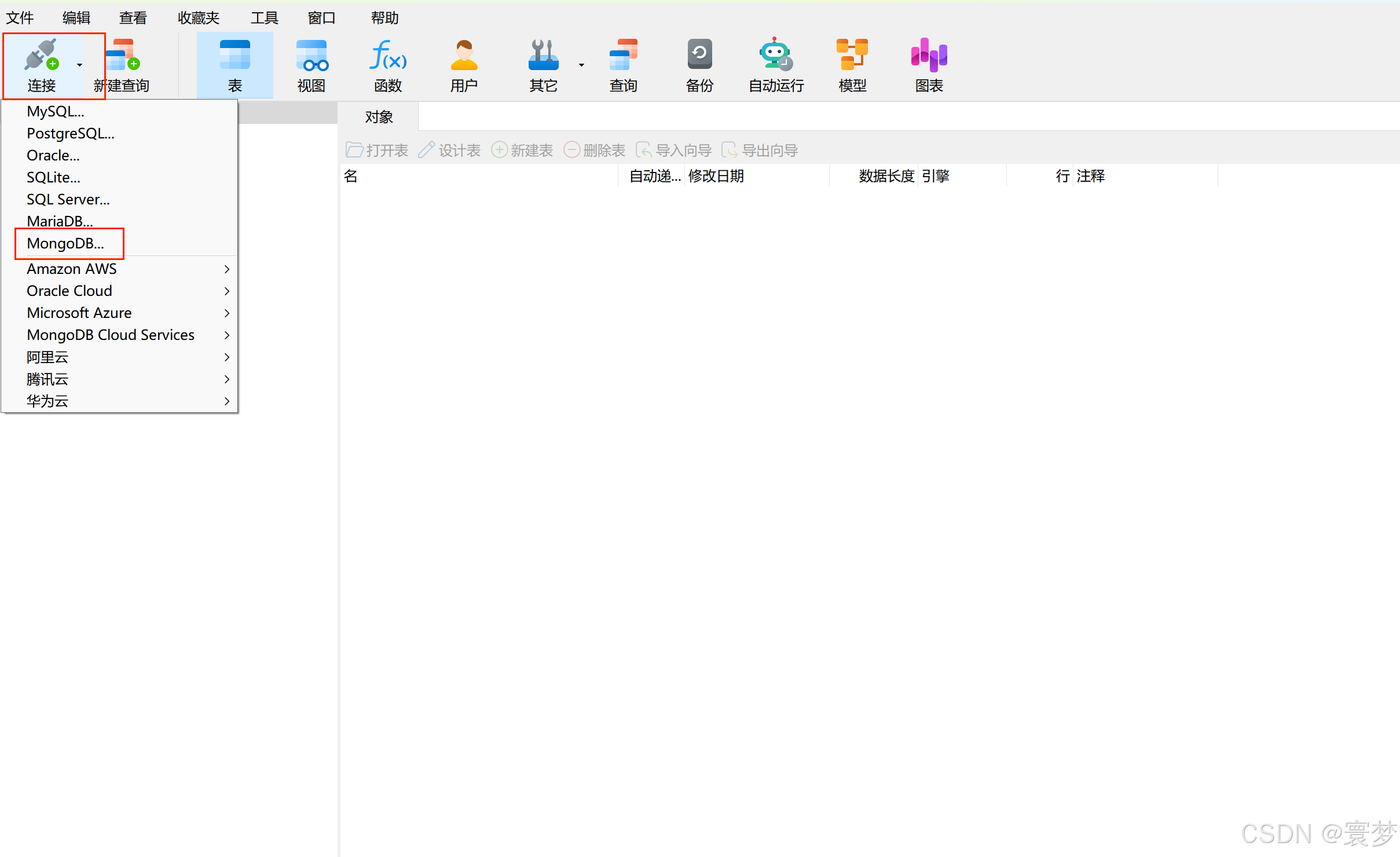 1.打开 navicat 新建数据库连接,选择mongodb