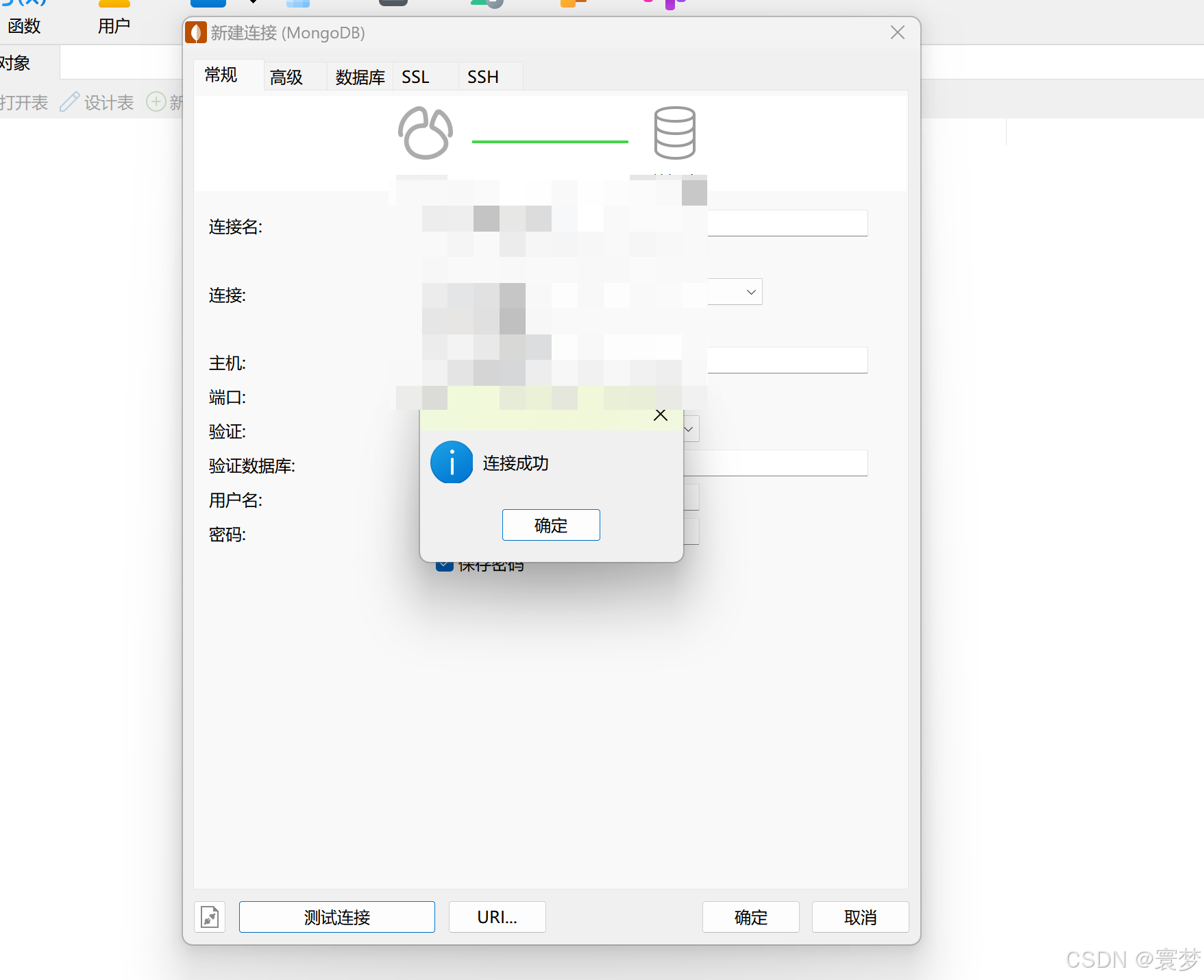 提示连接成功,此时,在点击右下角“保存”按钮,即可保存连接配置,这样就可以通过navicat去访问mongodb数据库了。